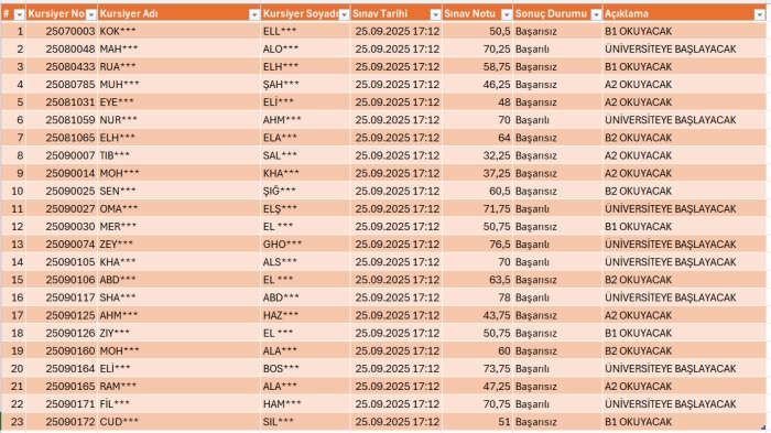 25.09.2025 Tarihinde Yapılan Türkçe Seviye Belirleme Sınavı Sonuçları