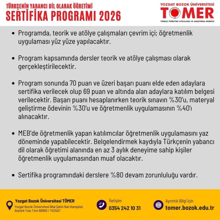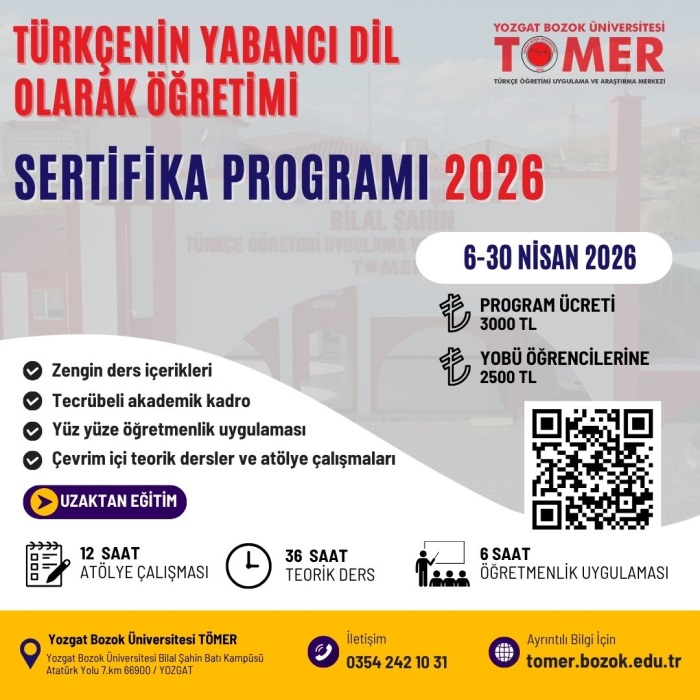 Yozgat Bozok Üniversitesi, Türkçe Öğretimi Uygulama ve Araştırma Merkezi (TÖMER) tarafından 6-30 Nisan 2026 tarihleri arasında "Türkçenin Yabancı Dil Olarak Öğretimi Sertifika Programı" düzenlenecektir. Program kapsamında yabancı ya da ikinci dil olarak Türkçe öğretiminde; temel ilkeler ve tarihi bilgiler, kullanılan programlar, müfredat hazırlama, söz varlığının geliştirilmesi, beceri temelli dil öğretimi ve materyal tasarımı, teknoloji tabanlı dil öğretim yöntemleri, beden dili kullanımı, ölçme ve değerlendirme, pedagojik yeterlikler ve drama konularında eğitimler verilecektir.